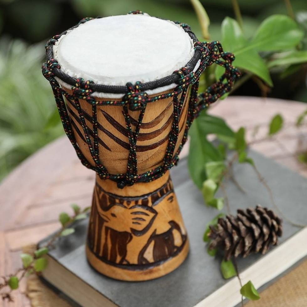 Elephant-Themed Mahogany Mini Djembe Drum from Bali 'Elephant Music' Item ID: 2671736938