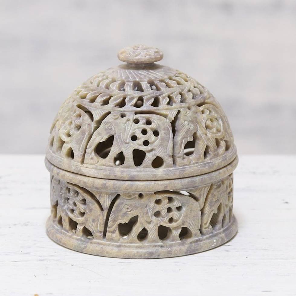 Elephant-Themed Soapstone Decorative Jar from India 'Elephant Alliance' Item ID: 2671790983