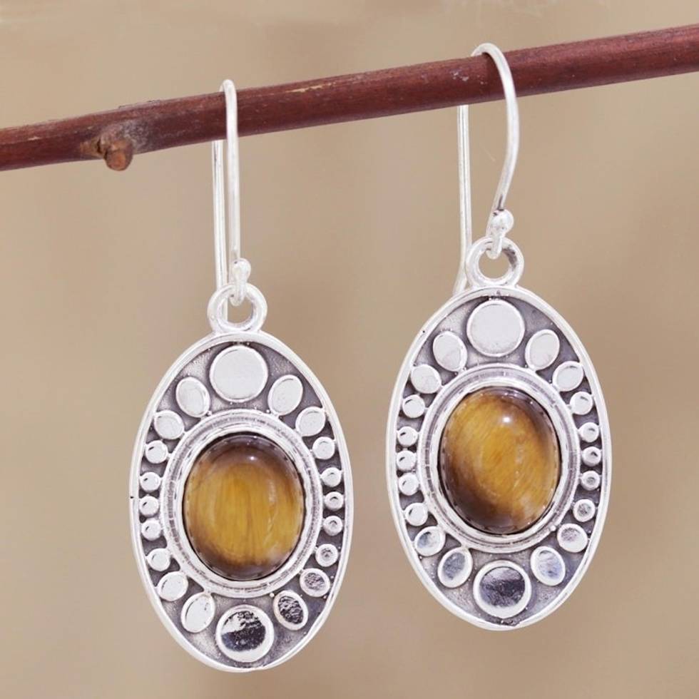Elliptical Tiger's Eye Dangle Earrings Crafted in India 'Elliptical Beauty' Item ID: 2671789413