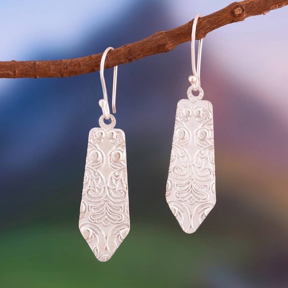 Embossed Geometric Sterling Silver Dangle Earrings 'Regal Fineness' Item ID: 2671698009