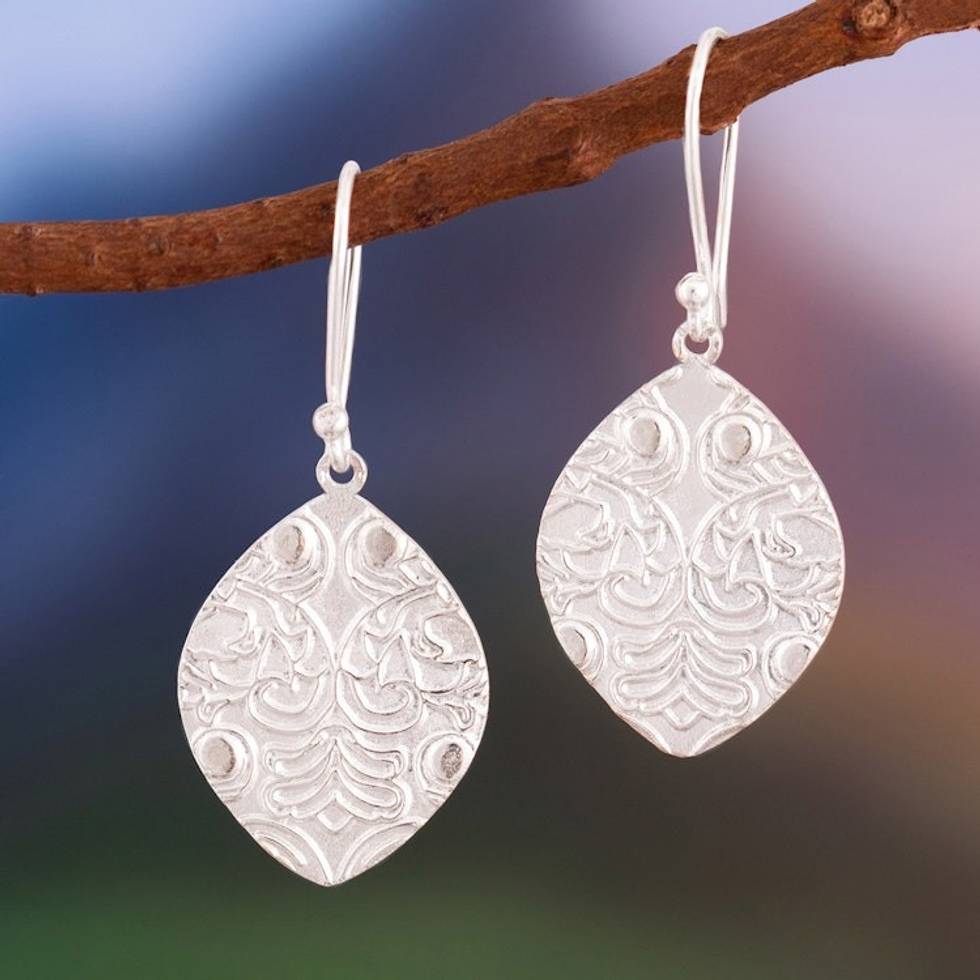 Embossed Leaf-Shaped Sterling Silver Dangle Earrings 'Leafy Fineness' Item ID: 2671697856