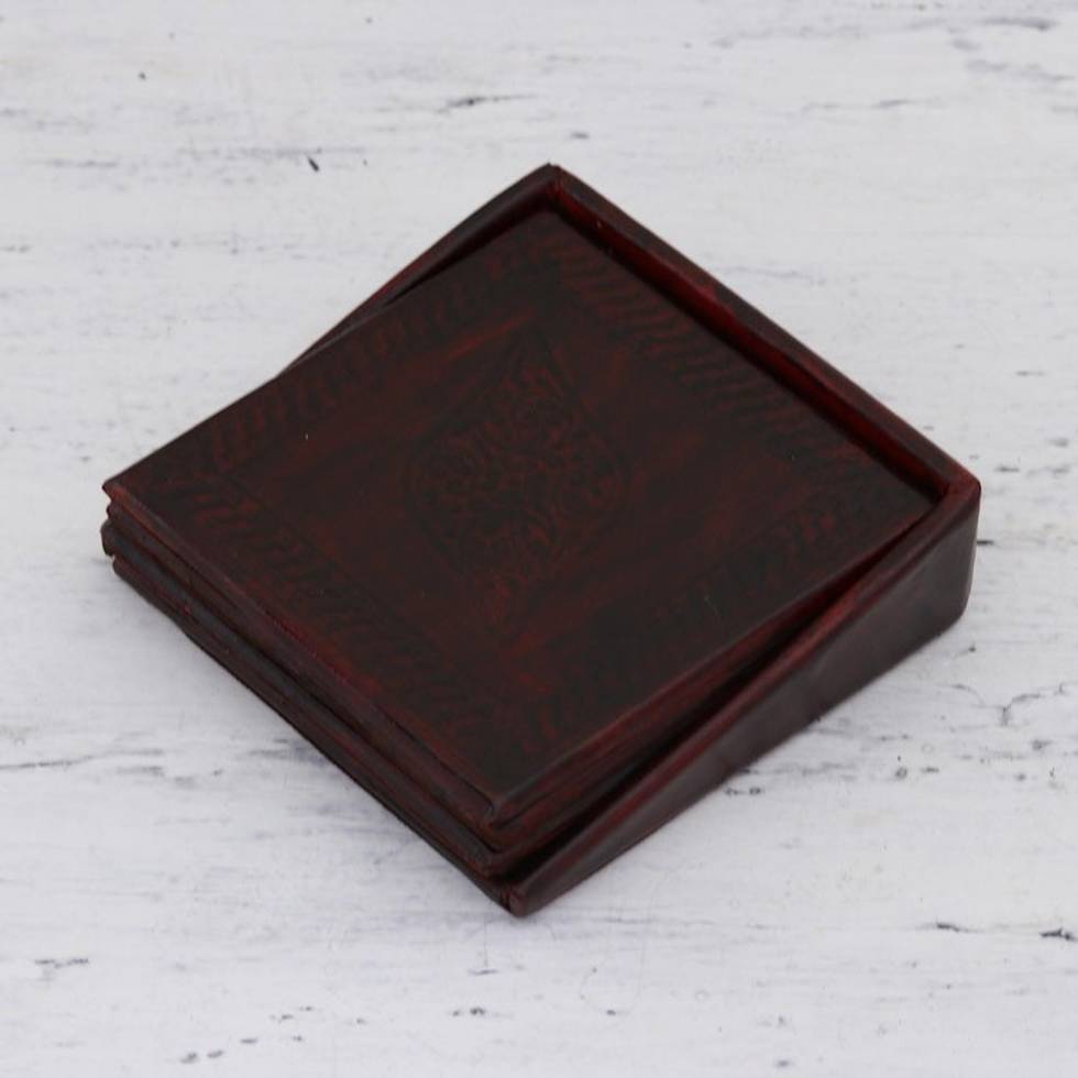 Embossed Leather Coasters from India Set of 4 'Leafy Intrigue' Item ID: 2669925152