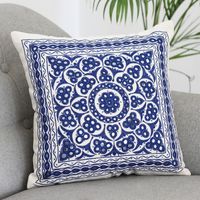"Hand embroidered by the artisans of India's SEWA organization, this cushion cover shimmers with reflective mirror-work. Hand crafted from cotton, the cover features a royal blue floral motif on an antique white base, a plain backing, and a cotton lining. A zippered opening lets you insert and withdraw your favorite cushions with ease. The SEWA organization, which stands for Self Employment Women Association, works with underprivileged women to provide them with self-employment research. Each SEWA purchase goes directly towards the rehabilitation of affected artisans."
