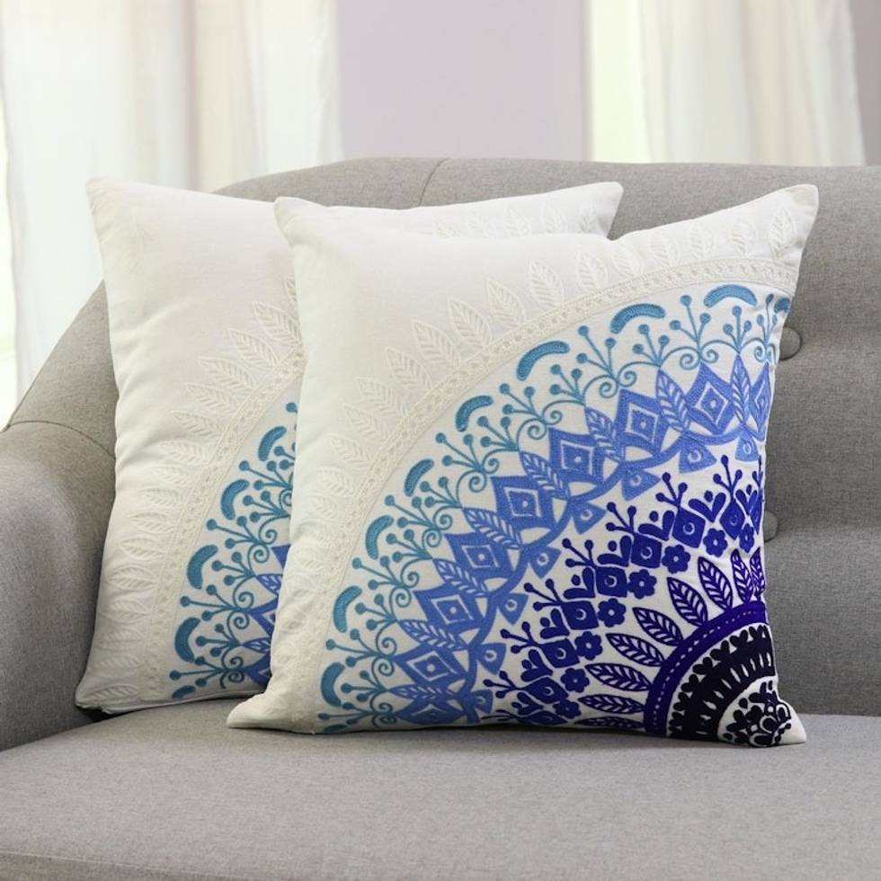 Embroidered Cotton Cushion Covers in Blue from India Pair 'Divine Orchard in Blue' Item ID: 2671792512