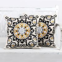 Embroidered Cotton Ecru Cushion Covers from India Pair 'Jaipur Blossom' Item ID: 2669924189