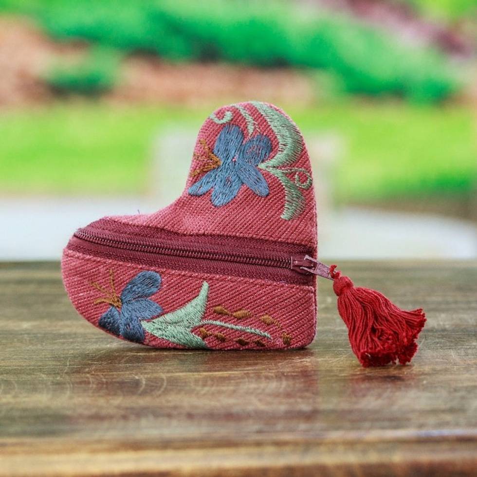 Embroidered Floral Heart-Shaped Burgundy Cotton Coin Purse 'Frugal Romance' Item ID: 2671807286