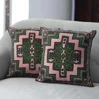 Embroidered Geometric Motif Cotton Cushion Covers Pair 'Spring Geometry' Item ID: 2671789206