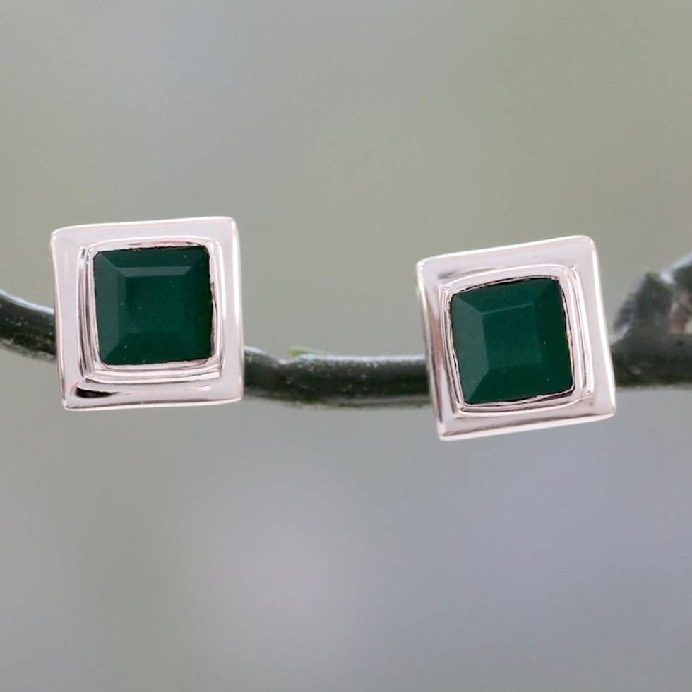 Enhanced Green Onyx Stud Earrings in 925 Silver 'Contemporary Squared' Item ID: 2671619049