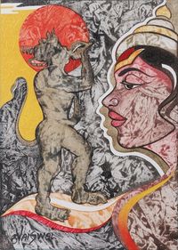 "Named after the sound a shell makes when being blown out, Shankh Naad is a sound of great importance in Hindu doctrine, as its mystic rhythm represents the divine spirit of Lakshmi and Vishnu. Now depicted in a sublime expressionist scene by Sunil Jaiswal, the sound is the main theme in this acrylic painting, whose elegant hues transport you to the core of Hindu philosophy.