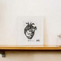"Guatemalan artist Spencer Samayoa's spectacular rendition of the human heart is a powerful and compelling artwork that stimulates the viewer to engage in a profound analysis and introspection, ultimately leading to the discovery of a personal interpretation and meaning. This remarkable black and white xylograph print will definitely be a conversation starter and the center of everyone's attention.