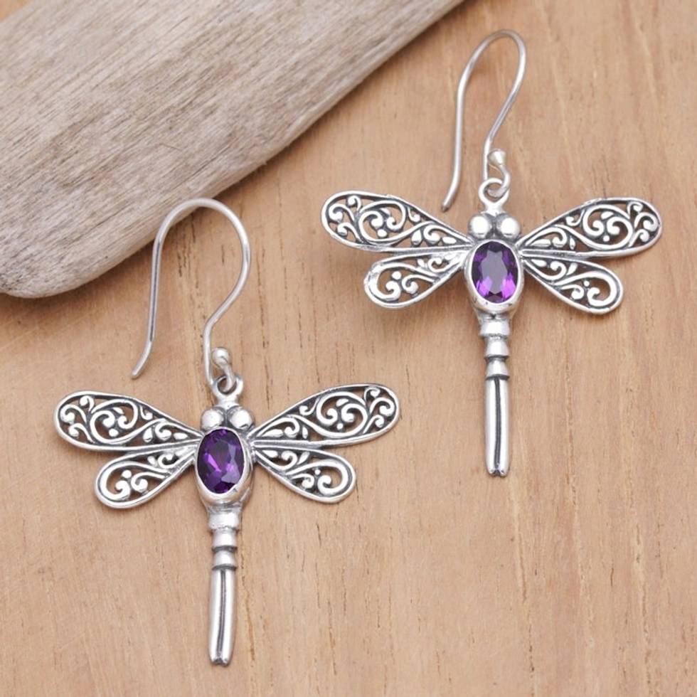 Faceted Amethyst Dragonfly Dangle Earrings from Bali 'Wisdom Prophecy' Item ID: 2671668085