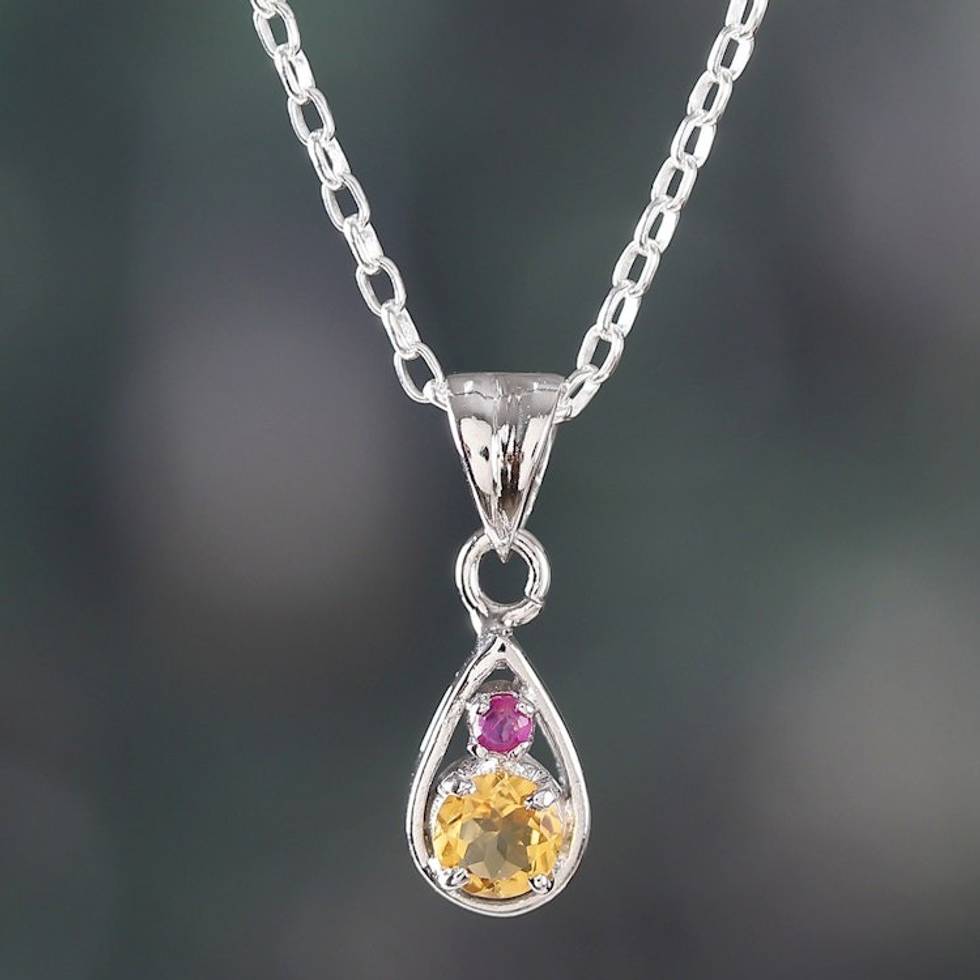 Faceted Round Citrine and Ruby Pendant Necklace from India 'Successful Caprice' Item ID: 2671781228
