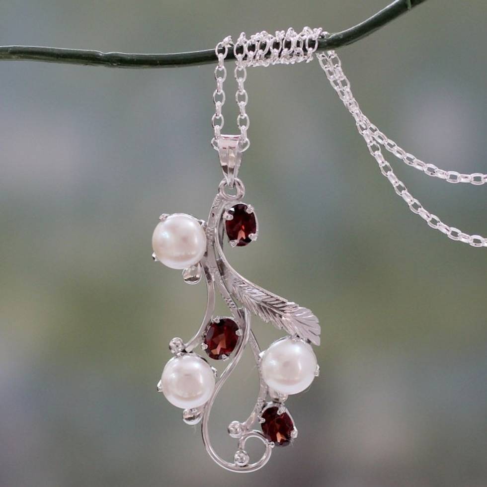 Fair Trade Floral Pearl and Garnet Pendant Necklace 'Dreamy Blossom' Item ID: 2671793572