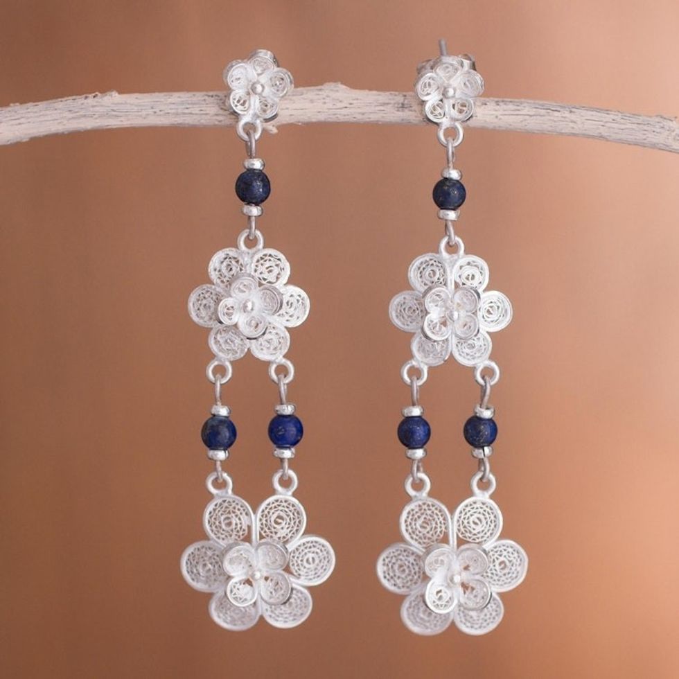 Fair Trade Floral Silver Dangle Lapis Lazuli Earrings 'Garlands' Item ID: 2671691405