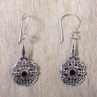 Fair Trade Garnet Dangle Earrings with Floral Motif 'Red Rafflesia' Item ID: 2671702501