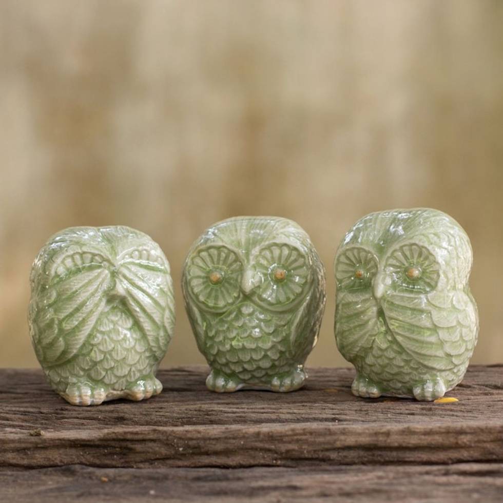 Fair Trade Green Celadon Ceramic Owl Statuettes set of 3 'Green Owl Trio' Item ID: 2671641267