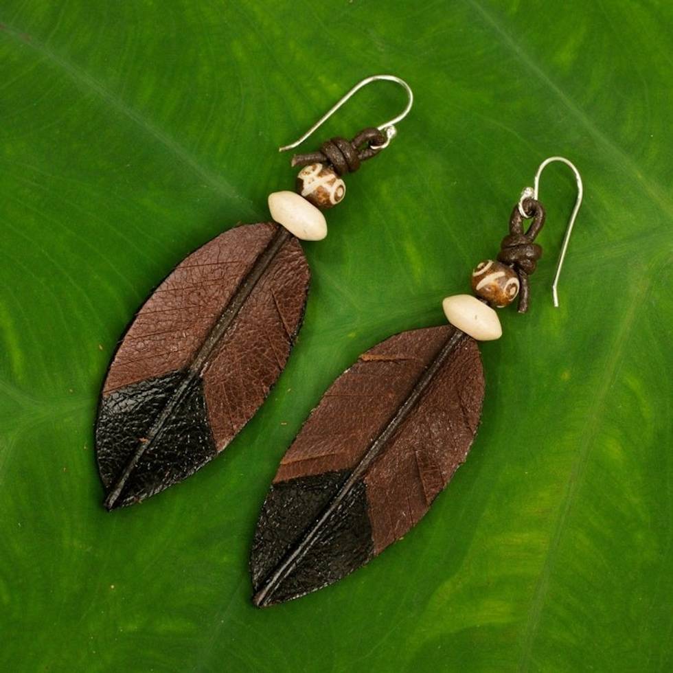 Fair Trade Handmade Leather Earrings from Thailand 'Leaf Feather' Item ID: 2671802398