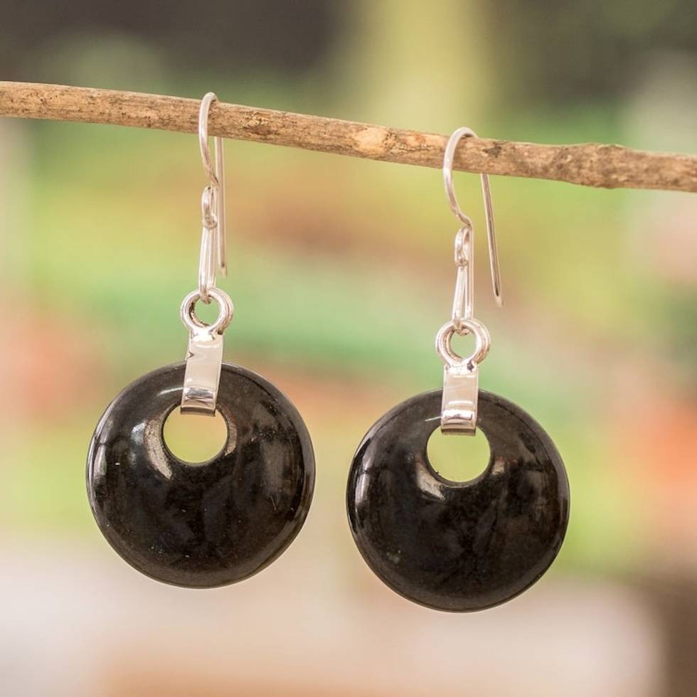 Fair Trade Jade Dangle Earrings with 925 Silver 'Black Maya Moon' Item ID: 2671626066