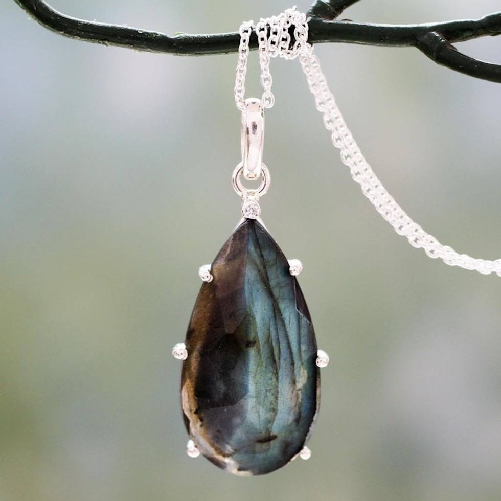 Fair Trade Labradorite and Sterling Silver Pendant Necklace 'Dusky Droplet' Item ID: 2671793569