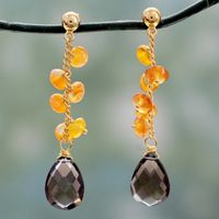 "Handcrafted of sterling silver bathed in 18k gold, these captivating earrings reveal a timeless elegance. Onyx leads the eye to smoky quartz teardrops in gold vermeil earrings from India's Mahavir. The quartz totals some 8 carats.