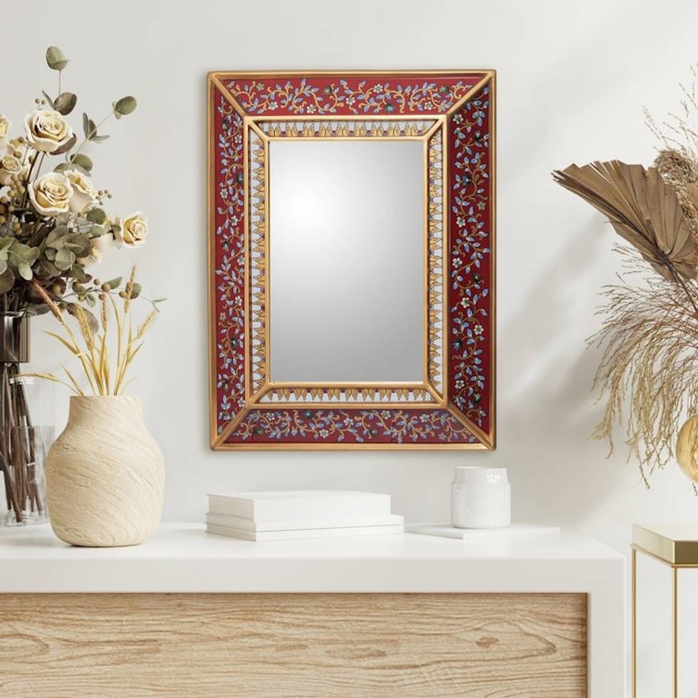 Fair Trade Reverse Painted Glass Mirror 'Bluebells on Scarlet' Item ID: 2671690876