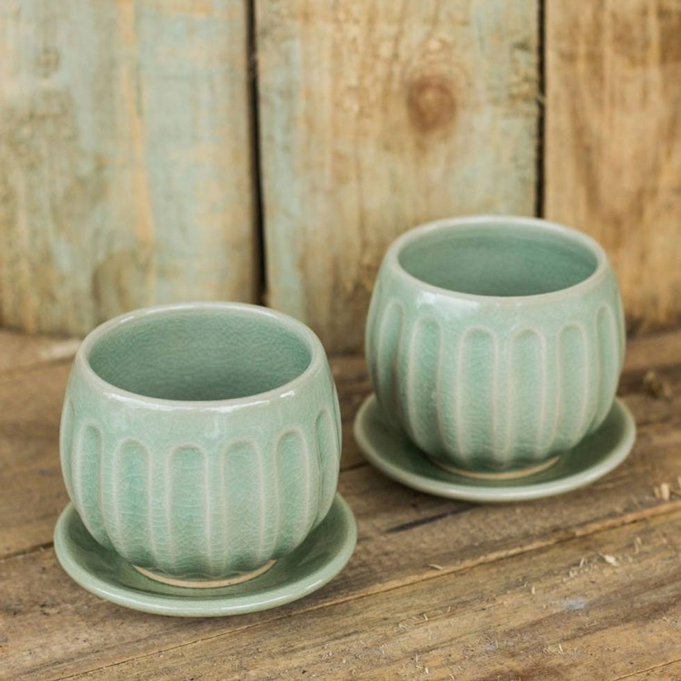 Fair Trade Thai Celadon Ceramic Teacups and Saucers pair 'Thai Jade' Item ID: 2671801940
