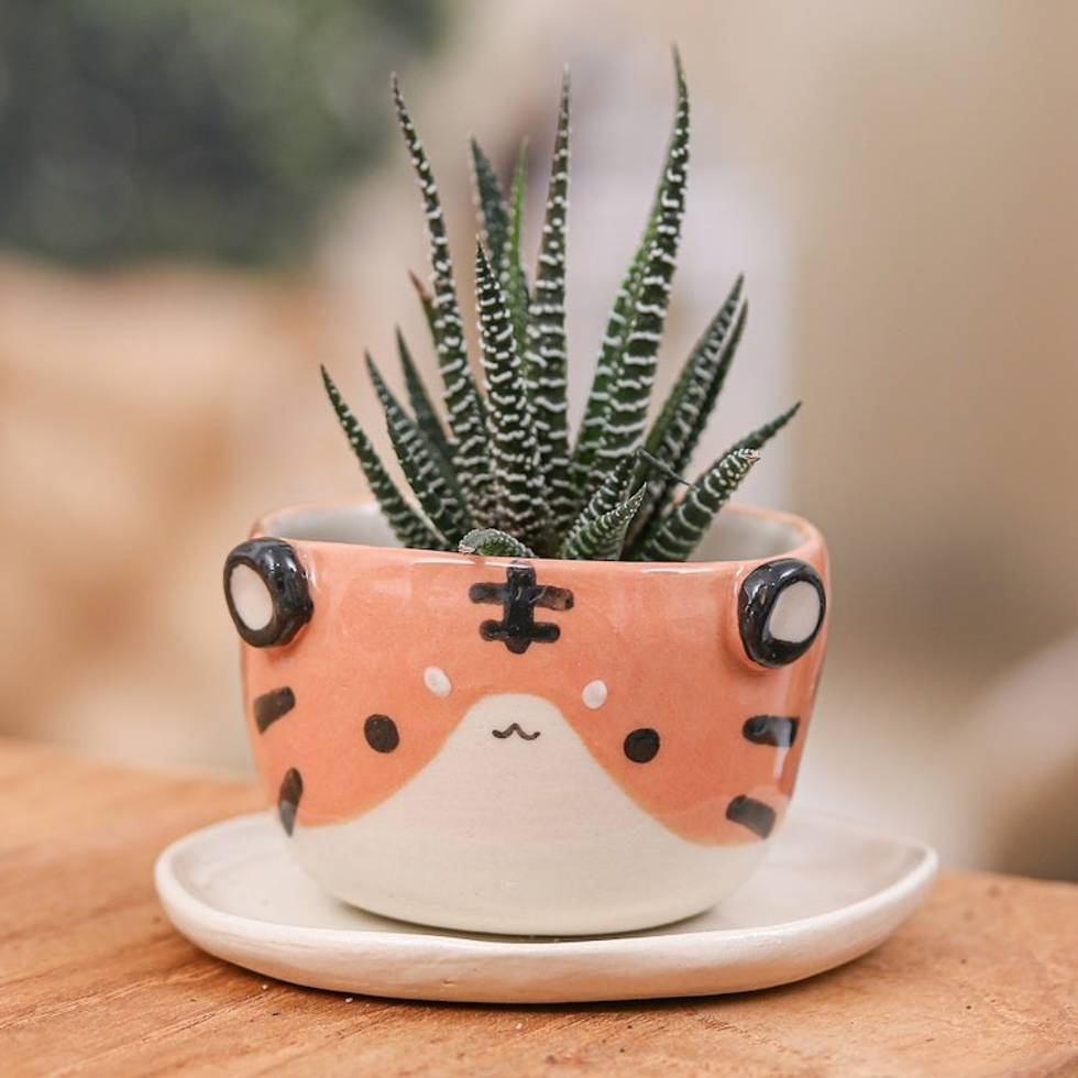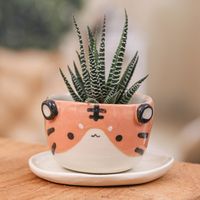 Fair Trade Tiger-Themed Mini Flower Pot and Saucer Small 'Tiger Spring' Item ID: 2671796544