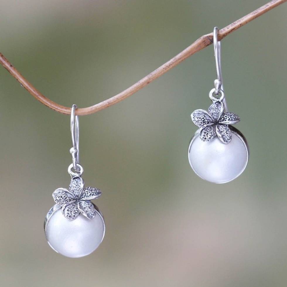 Fair Trade White Pearl Dangle Earrings 'Plumeria Moon' Item ID: 2671476433