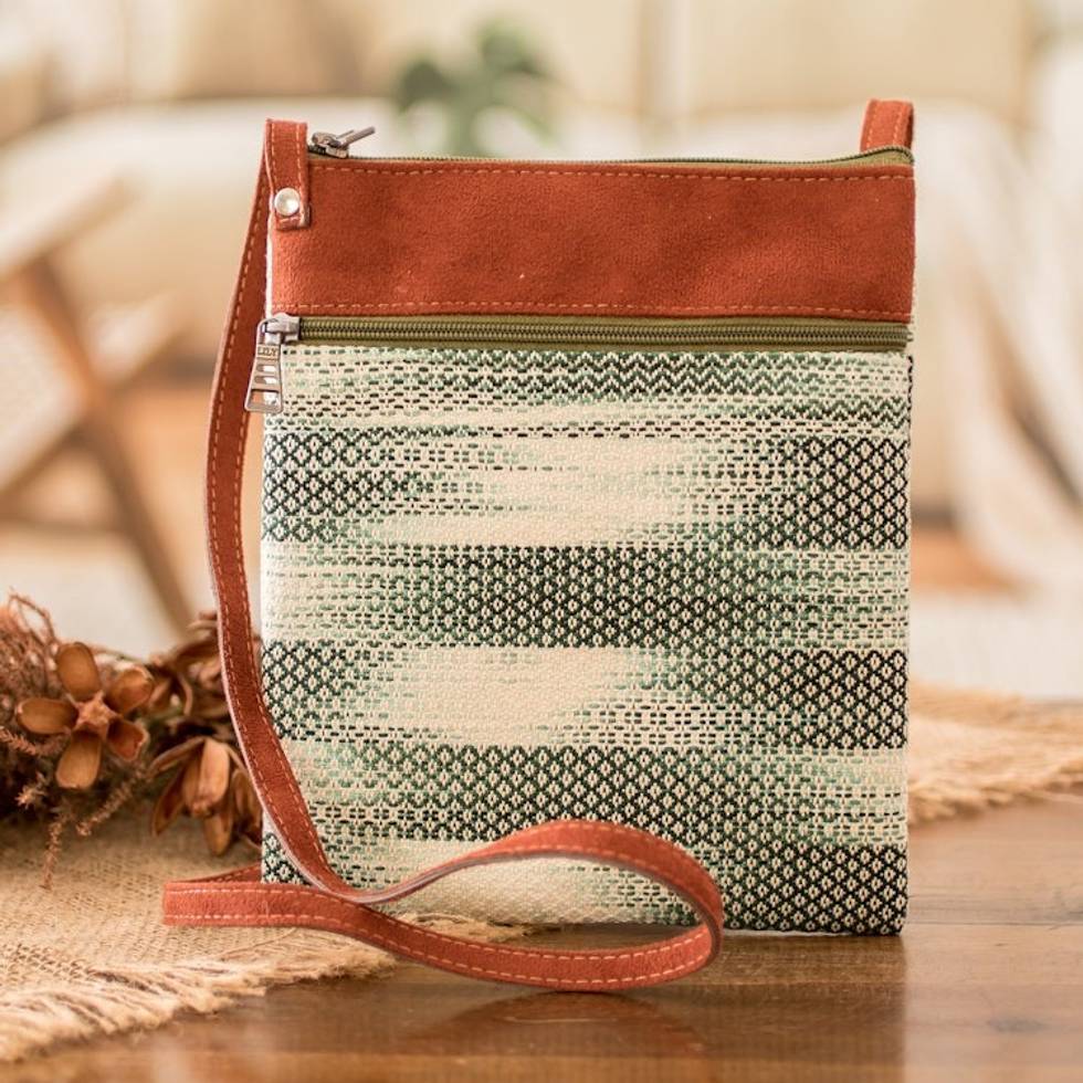 Faux Leather-Accented Cotton Sling Bag in Forest Green Hues 'Forest Beauty' Item ID: 2671626854