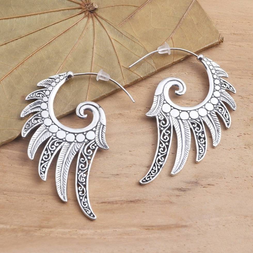 Feather Motif Sterling Silver Half-Hoop Earrings 'Feathered Garland' Item ID: 2671744947