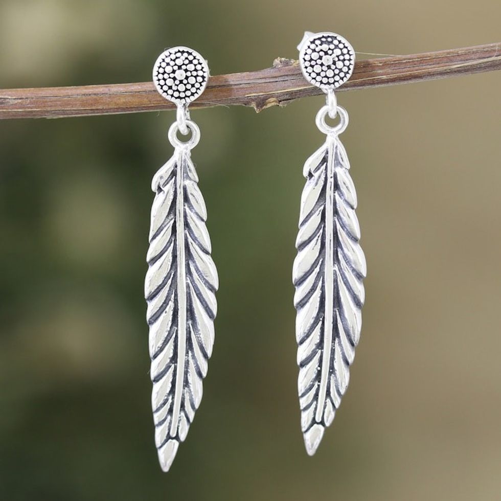 Feather-Themed Sterling Silver Dangle Earrings from India 'Feathered Luxury' Item ID: 2671786609