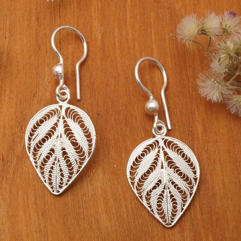 "Etched with botanical splendor and boasting an elegant matte finish, these leaf-themed sterling silver filigree dangle earrings reflect the quiet complexity of nature. Antarina of Java draws out the beauty in every vein and curve, creating a design that feels both organic and finely composed, perfect for any occasion."