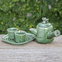 Fish-Themed Green Ceramic Tea Set with Two Cups and a Tray 'Cozy Fins' Item ID: 2671641095