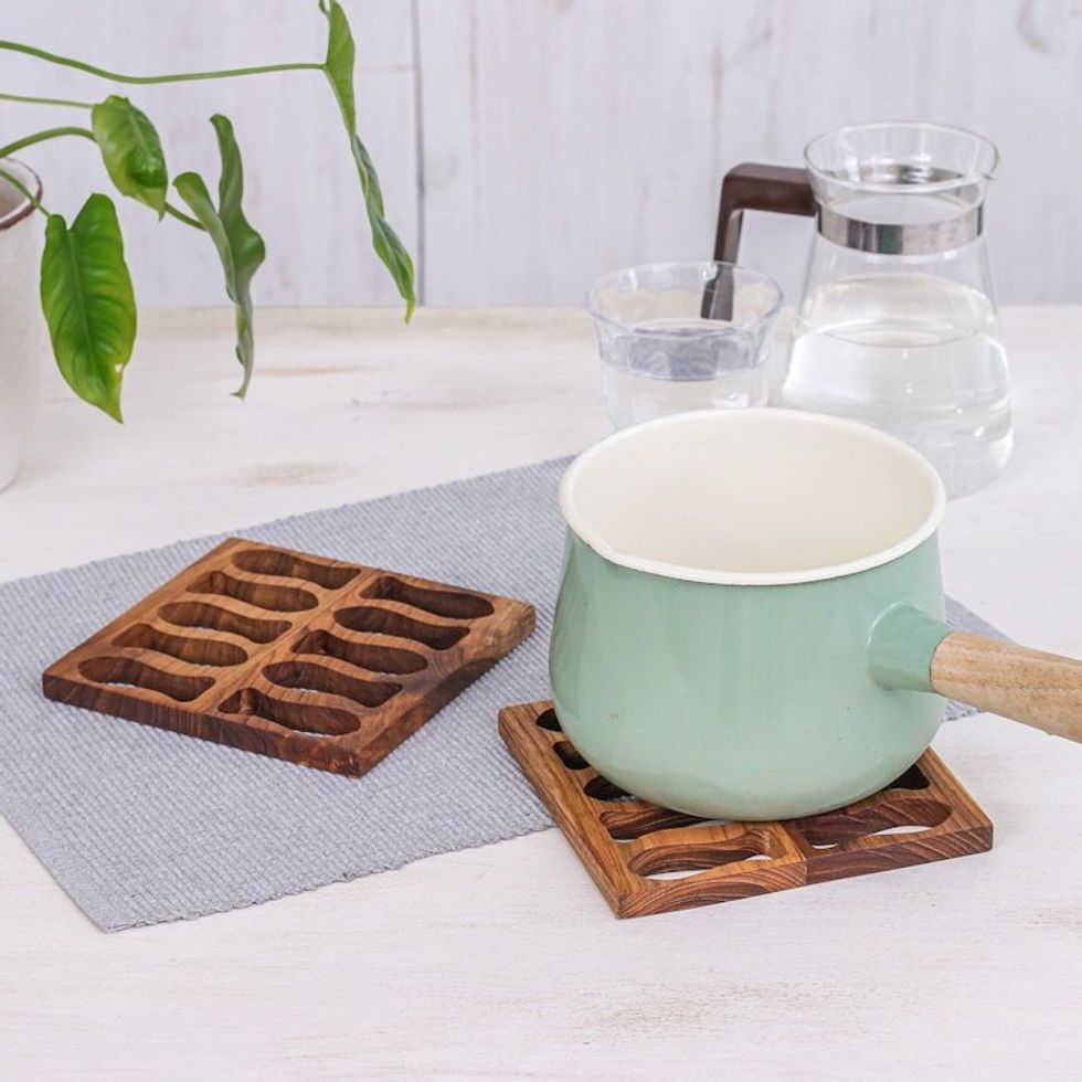 Fish-Themed Hand-Carved Square Brown Teak Wood Pot Stand 'Swimming Delicacies' Item ID: 2671797164