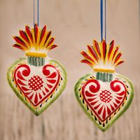 Flaming Heart Ceramic Ornaments from Mexico Pair 'Flaming Hearts' Item ID: 2671808042