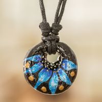 Floral Adjustable Painted Ceramic Pendant Necklace in Blue 'Night's Blue Grace' Item ID: 2669923658