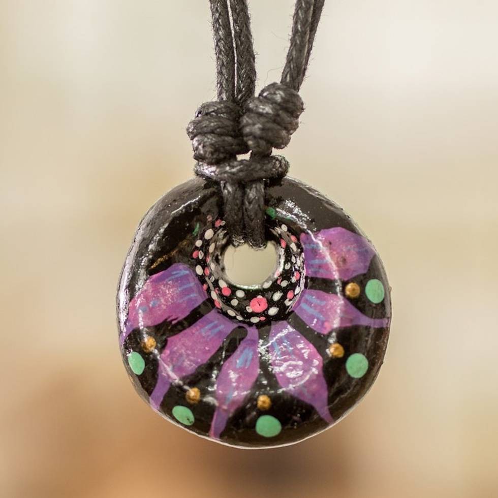 "The grace of the Guatemalan nights is captured in a charming design that pays honor to the region's natural richness and arts. Pedro Apop creates this pendant necklace from ceramic using a long process that allows him to craft the round piece that dangles from the adjustable cotton cord. As a touch of uniqueness, the artisan also hand-paints the pendant with a floral design, whose palette of purple, green and black hues creates an enchanting vibe. In addition, a sliding knot makes it possible to transform the accessory into a choker or a long necklace."
