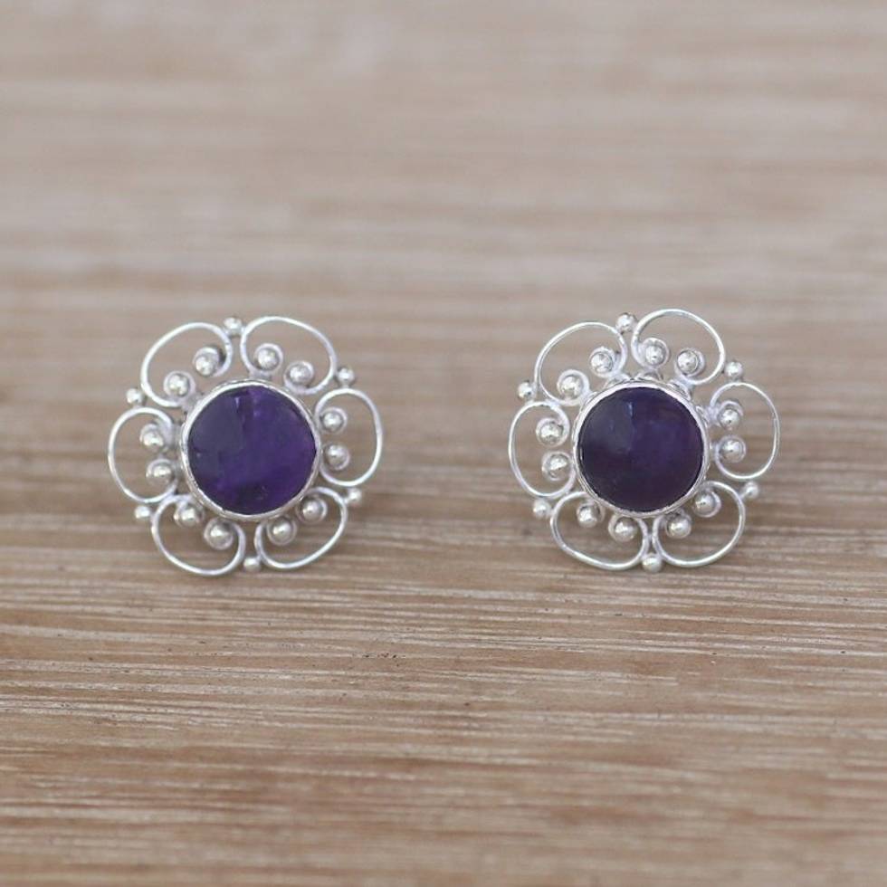 Floral Amethyst Button Earrings from Bali 'Purple Jepun' Item ID: 2671736723