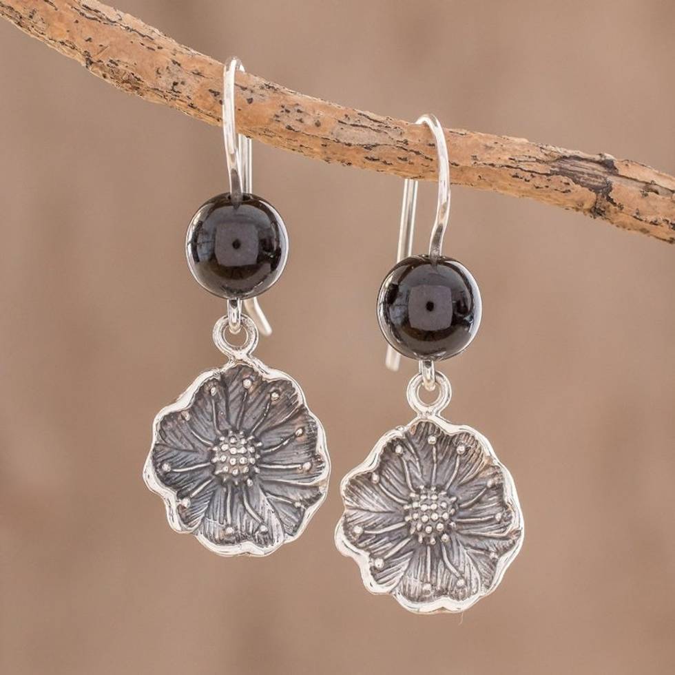 Floral Black Jade Dangle Earrings from Guatemala 'Guatemalan Flowers' Item ID: 2671778917