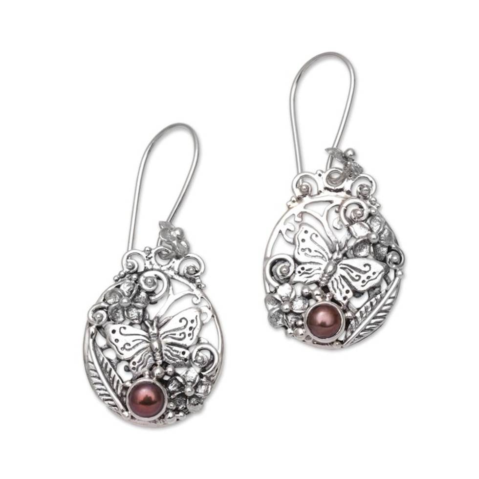 Floral Butterfly Cultured Pearl Earrings from Bali 'Butterflies and Frangipani' Item ID: 2671736704