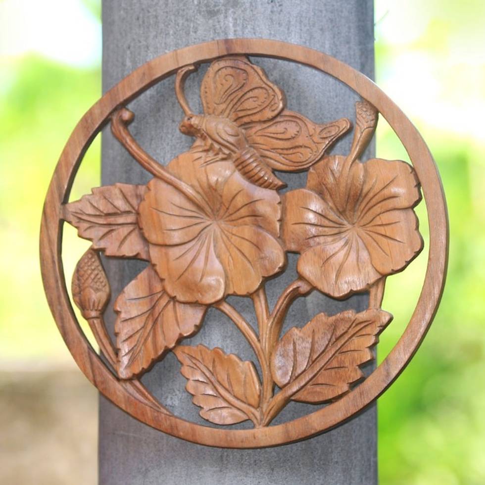 Floral Butterfly Suar Wood Relief Panel Crafted in Bali 'Butterfly on a Flower' Item ID: 2671821832