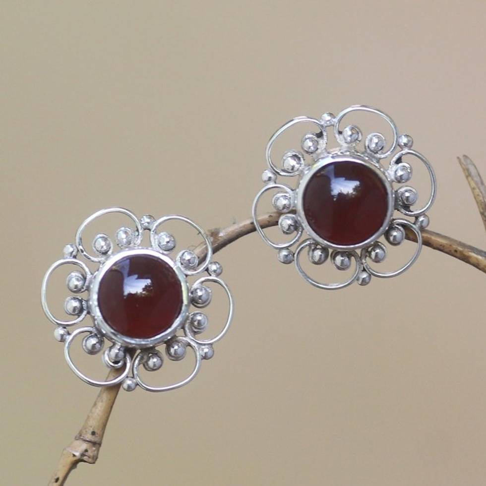 Floral Carnelian Button Earrings from Bali 'Red Jepun' Item ID: 2671735313