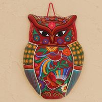 Floral Ceramic Owl Wall Sculpture in Red from Mexico 'Passionate Owl' Item ID: 2671808943