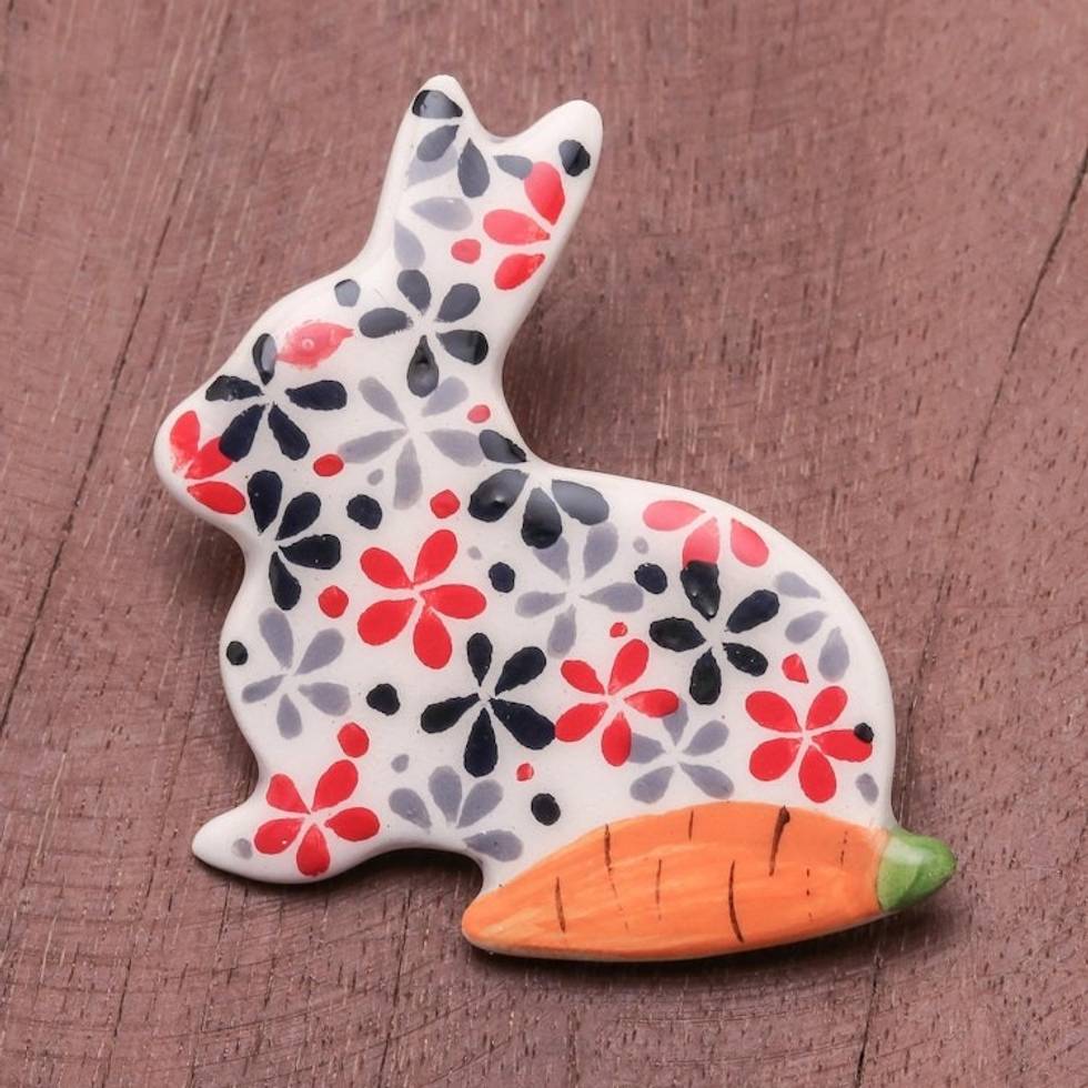 Floral Ceramic Rabbit Brooch Pin from Thailand 'Rabbit and Carrot' Item ID: 2671799231