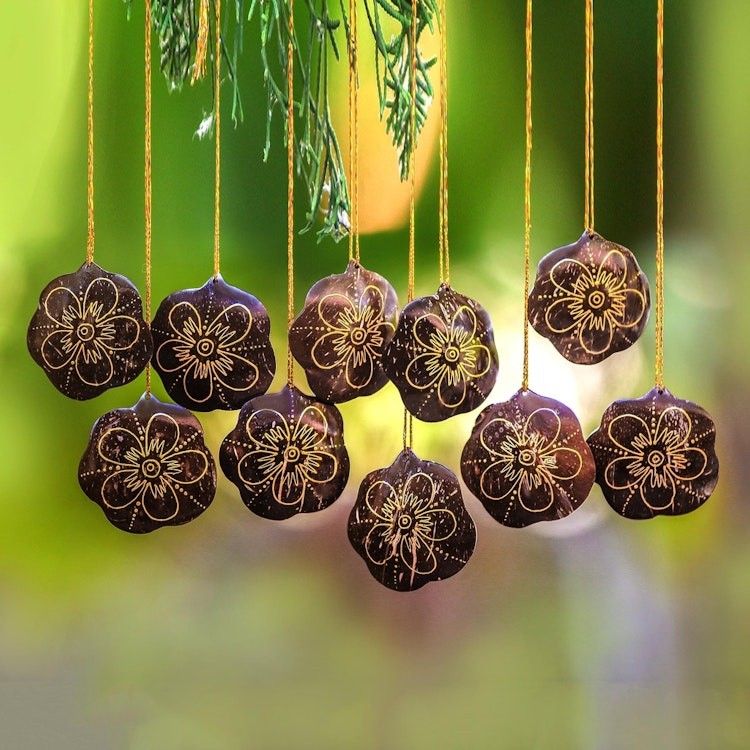 Floral Coconut Shell Ornaments from Bali Set of 10 'Dawn Flowers' Item ID: 2671737528