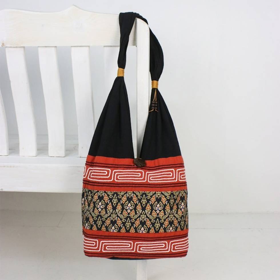 Floral Cotton Blend Shoulder Bag in Paprika from Thailand 'Charming Thai in Paprika' Item ID: 2671801589