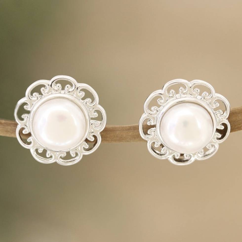 Floral Cultured Pearl and Sterling Silver Button Earrings 'Blossom in White' Item ID: 2671787403