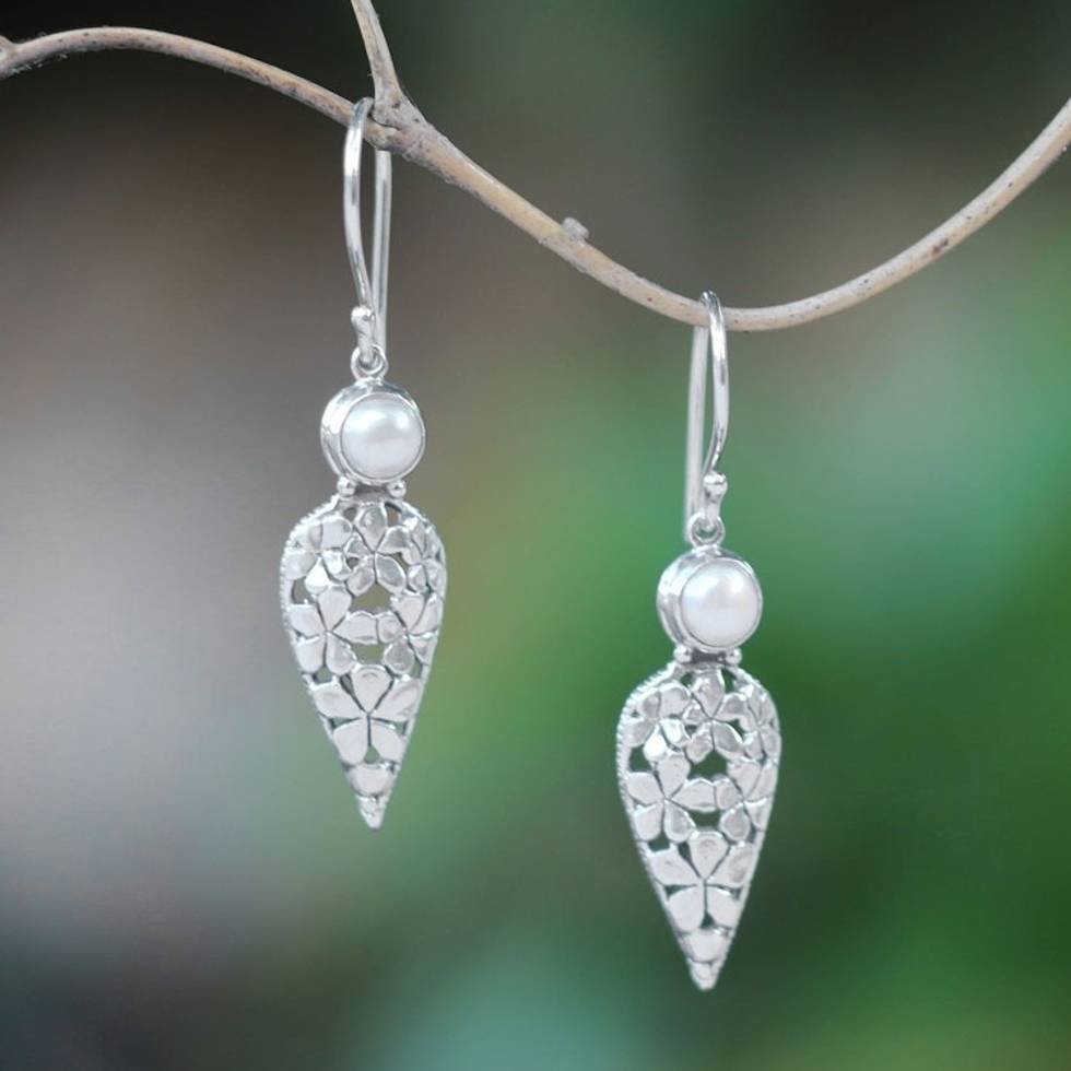 Floral Cultured Pearl Dangle Earrings Crafted in Bali 'Jepun Blades' Item ID: 2671736586