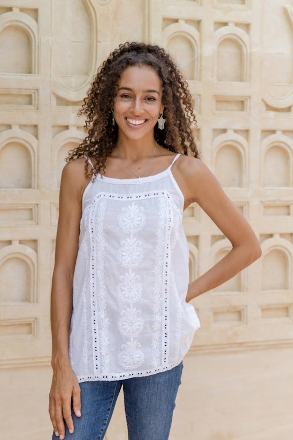 Floral Embroidered White Cotton Tank Top from India 'Beautiful Summer' Item ID: 2669924371