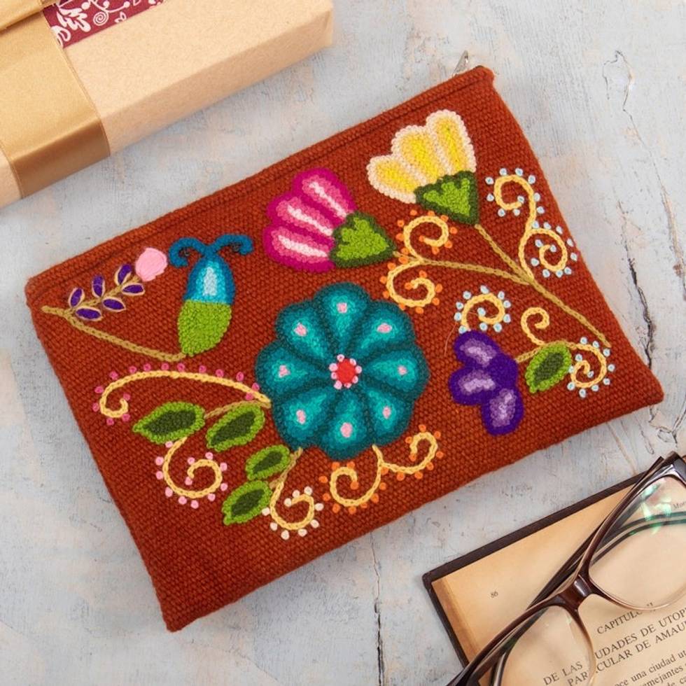 Floral Embroidered Wool Cosmetic Bag from Peru 'Eden Cinnabar' Item ID: 2671402473